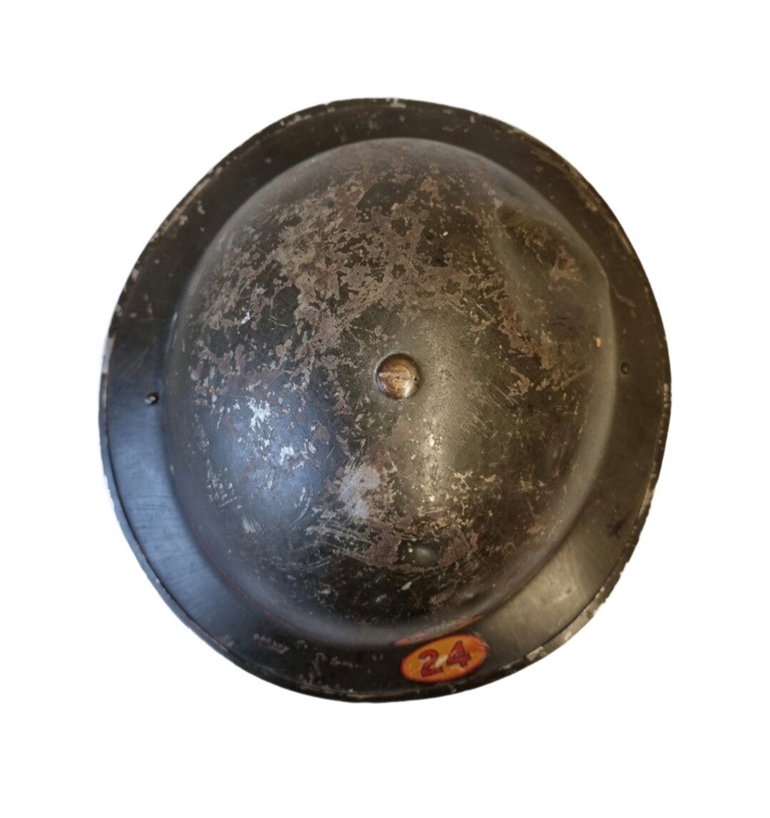 A rare ww2 National Fire Service Helmet numbered 24 for Birmingham area which has been serverley damaged from the Birmingham Blitz! 1939 dated and has it's original liner and chinstrap, Overall a fantastic piece of ww2 british Blitz History!